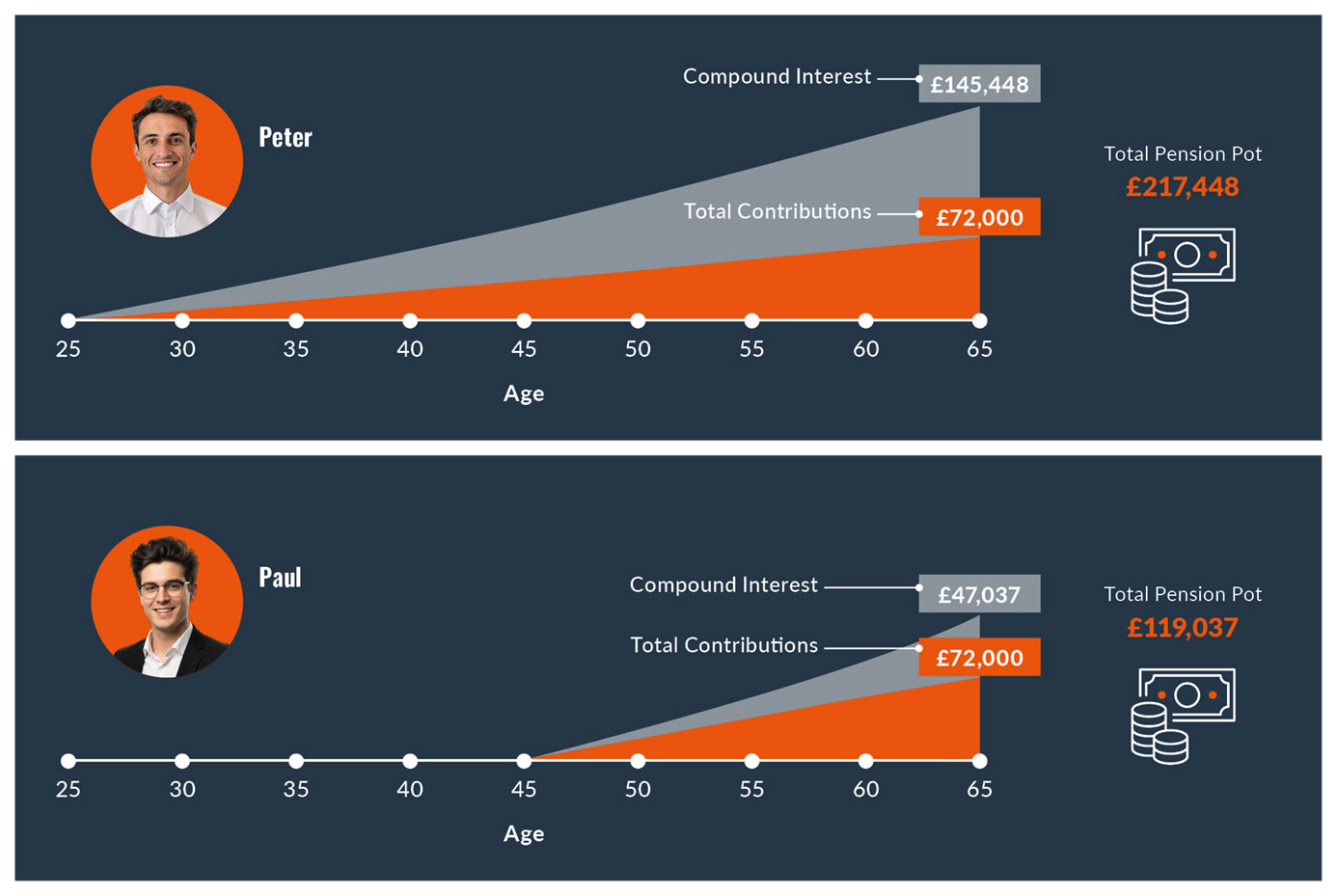 Peter and Paul are old school friends and they are now both 25 years old, working full-time and are each earning £28,000 a year. When they meet for a catch-up, they discuss whether they should begin putting something aside each month for their retirement.